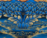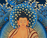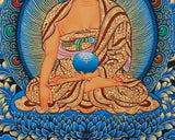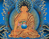 In this revered thangka, the Dharma Teacher Buddha Shakyamuni is beautifully depicted, embodying the knowledge, compassion, and teachings that have guided countless beings toward enlightenment. This thangka, created on fine cotton canvas using acrylic colors and genuine 24K gold, showcases a splendid example of traditional artistry. The blue canvas serves as a profound backdrop, symbolizing the vast expanse of wisdom and the limitless nature of enlightened awareness, while the gold detailing enhances the intricate beauty of the composition. The gold detailing further enriches the composition with intricate patterns on Buddha's robes and a luminous halo that encircles him.