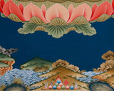 The hand-painted Buddha thangka features Bhaisajyaguru, also known as the Lapis Lazuli Medicine Buddha. In Tibetan Buddhism, he is revered as the Supreme Healer, embodying the power to heal both physical and spiritual ailments. Measuring 20 inches (51 cm) in width and 30 inches (76 cm) in height, this large artwork is painted on premium cotton canvas, ensuring durability and vibrant colors. The Buddha is depicted holding a healing bowl, which symbolizes his ability to alleviate suffering and provide protection.