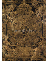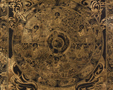 The Wheel of Life Thangka (Bhavacakra) represents the intricate Buddhist depiction of Samsara, the cycle of birth, life, death, and rebirth. This exceptional work of art is fully embellished with gold on a black canvas, showcasing the profound intricacies of the teachings on suffering and liberation.