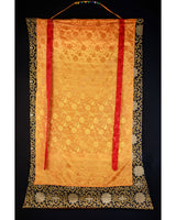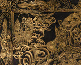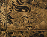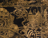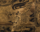 The gold on the black canvas enhances the dramatic and rich detail of this piece. The artwork is mounted in a traditional brocade frame, contributing to its elegance and reverence in Buddhist art. The use of pure gold highlights the cosmic nature of the teaching, emphasizing the spiritual journey and the importance of attaining Nirvana.