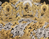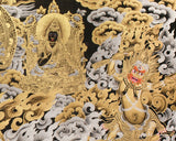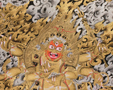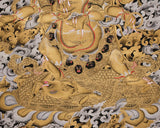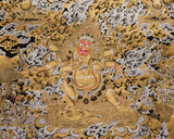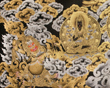 This Thangka is created with unparalleled skill, using a brilliant combination of gold and silver composition to bring Mahakala’s presence to life. The gold detailing highlights the divine power of Mahakala. At the same time, the silver elements add a layer of ethereal elegance, balancing the deity's fierce nature with the spiritual realm's serene tranquility. The skillful use of these precious materials elevates the Thangka, adding to its premium status as a rare and highly valuable piece of religious art.