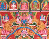 The four arms that Chenrezig, the Bodhisattva of Compassion, is shown with represent his capacity to reach out and alleviate the suffering of creatures in all directions. Holding symbolic tools that symbolize his enlightened activities, he sits in the formidable vajra stance and exudes patience and kindness. This depiction highlights his pivotal role in directing and safeguarding the cosmos since other worldly deities surround him. His elevated position in the pantheon of Buddhist deities is indicated by the intricately designed throne.