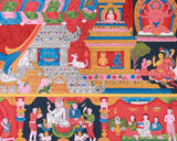 Using fine cotton canvas as a foundation for intricate acrylic paintings gives the depiction of Chenrezig depth and vitality, celebrating exceptional artistry. In addition to emphasizing the divine presence encircling Chenrezig, the abundant use of 24K gold elaborately adorns the throne and surrounding motifs, heightening the artwork's visual impact and holiness. Every aspect of Chenrezig is accurately shown, capturing the rich Paubha tradition, from his tender gaze to the delicate lotus he holds.
