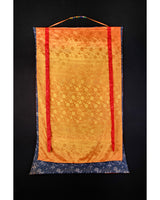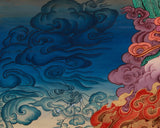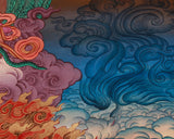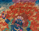 The Tibetan Wrathful Deity Vajrapani is honored as the protector of the Buddha and the embodiment of divine power in Tibetan Buddhism. Vajrapani, depicted in a dynamic pose, holds the vajra (thunderbolt) in one of his six arms, symbolizing his role in dispelling ignorance and safeguarding the Dharma. His fierce, fiery expression and intense posture convey his strength, wrath, and mission to overcome obstacles, transforming negative forces into wisdom. This Thangka is meticulously crafted with gold highlights and vibrant acrylics on canvas, providing a detailed, rich visual experience. The brocade-mounted frame adds elegance, completing the artwork with a sense of sacredness and reverence.