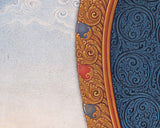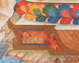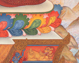 Known as Siddhartha Gautama when he was born in the sixth century BCE, Buddha Shakyamuni is regarded as the founder of Buddhism. Born into a wealthy family in the Shakya kingdom of modern-day Nepal, Siddhartha experienced a radical change in his upbringing when he faced the unavoidable truth of human suffering. Motivated by a sincere desire for comprehension, he abandoned his life as a royal to go on a spiritual journey. He became a Buddha after years of meditation when enlightenment appeared beneath the Bodhi tree in Bodh Gaya, India. Entire Buddhas and Bodhisattvas serve as guardians, providing a wider context for deep teachings, while angry and calm protective deities act as wards against dangers. The Refuge Tree's significance is enhanced by inscribed sacred texts, mantras, and symbolic elements, as well as depictions of sacred landscapes associated with Guru Rinpoche. The Nyingma tradition's spiritual lineage, wisdom, and transformative essence can be communicated with through this thangka, an exquisite expression of devotion and meditation.