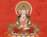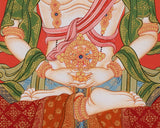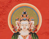The Vairochana Buddha Thangka portrays one of the Five Dhyani Buddhas in Tibetan Buddhism. He is frequently linked to knowledge and is seen as the Buddha's embodiment of the Dharmakaya, or truth body. He is seated on a lotus base, signifying his enlightenment and purity. He has four heads, which stand for omniscient wisdom and the embodiment of Dharmakaya. He is adorned with a crown, necklaces, and armlets, symbolizing his divine status, wisdom, power, and compassion. This stunning thangka preserves the rich heritage of Tibetan art, meticulously hand-painted on premium cotton canvas. Vibrant acrylics enhance its dimensionality and intricate details, while genuine 24K gold imparts a sacred luminosity, signifying wisdom and enlightenment.