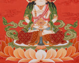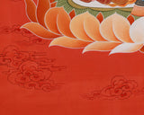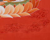 To emphasize his presence throughout the universe, he carries a Dharma wheel, which represents teachings and the cycle of samsara leading to enlightenment. His divine presence is further highlighted by his five-jewel crown, which represents the five wisdoms. The halo's vivid colors and the intricate golden details around his robe stand in for the energy and light that emerge from him, signifying enlightenment and the eradication of ignorance. The thangka's red background represents passion, while the clouds represent Vairochana's cosmic influence and interconnection, stressing his pivotal role in Buddhist cosmology as well as his dynamic, energetic insight.