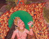 Buddha Shakyamuni is positioned at the top of the thangka in this composition, ruling over the scene as a representation of the pinnacle of wisdom and enlightenment. His presence emphasizes the function of Vajrayogini as a means of achieving enlightenment. At the bottom, next to Vajrayogini, are the Green Tara and White Tara, which stand for protection and compassion. White Tara is associated with healing and longevity, whereas Green Tara is associated with gifts that come quickly. Vajrayogini herself, in vivid red, is holding a kapala to represent the essence of enlightenment and a kartika knife to represent the slicing away of ignorance. Her blazing halo and strong posture symbolize her active energy, enabling practitioners to overcome barriers and delusions on the way to spiritual freedom.