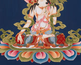 She is adorned with exquisite ornaments, including a five-jeweled crown, stunning necklaces, and elegant earrings, highlighting her divine essence and compassionate service to all beings. Her radiant halo features a delicate golden design, reinforcing her divine nature and representing her connection to the Buddha's wisdom and the compassion she offers to the world. The thangka's background showcases a rich, deep blue that contrasts beautifully with the vivid colors of her garments and the lotus petals surrounding her, imparting a calm and serene presence. The intricate flow of her robes further elevates her ethereal aura.
