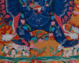 This magnificent Yamantaka with Other Deities Thangka depicts one of Vajrayana Buddhism's most powerful wrathful deities, well-known for his role in removing barriers, death, and ignorance. Yamantaka is depicted in his blue form with several faces, each of which stands for different aspects of his furious aggression and boundless wisdom. His power to purify and change the darkness of ignorance into the light of wisdom is further highlighted by the fiery halo that surrounds him. The artwork is adorned with 24K gold for a spiritual glow, and its cotton canvas design ensures longevity and a pleasing texture.