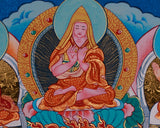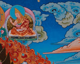 He is seen standing in a wrathful posture upon a lotus base with multiple arms, each of which is clutching symbolic items such as a skull cup (kapala), or a vajra (thunderbolt), and many other sacred objects all of which symbolize his ability to break the bonds of illusion and destroy evil forces. The thangka, a sacred Tibetan Buddhist painting, features several significant spiritual figures, including Tsongkhapa, the founder of the Gelug tradition, who emphasizes the connection between wisdom and compassion.