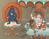 The Jambhala Thangka Print captures the essence of prosperity and abundance revered within Tibetan Buddhist tradition. Jambhala, known as the deity of wealth and abundance, is depicted in this sacred artwork with resplendent grace and divine majesty. Adorned with symbols of wealth and prosperity, Jambhala exudes an aura of generosity and benevolence, symbolizing the boundless abundance available to all beings. With one hand holding a mongoose spouting jewels and the other hand gesturing in a mudra of generosity, Jambhala embodies the power to bestow material wealth and financial prosperity upon devotees. This Thangka print serves as a visual reminder of Jambhala's blessings and the potential for abundance in all aspects of life. Displaying this sacred artwork in homes and sacred spaces invites the blessings of Jambhala, inspiring practitioners to cultivate a mindset of abundance and generosity, leading to both material and spiritual fulfillment.