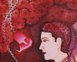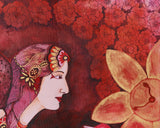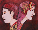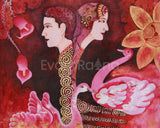 This stunning Beautiful Couple Canvas is expertly designed to combine traditional symbolism with modern aesthetics. This been printed in brilliant red and gold on superior Giclée cotton canvas for an authentic, visual touch. The central figures—male and female profiles—are ornamented with ornate headpieces that represent the heavenly union of wisdom and compassion. Elegant swans indicate purity and transcendence, while a golden lotus grows to symbolize enlightenment in the face of difficulties in life. An unending knot graces the corner, symbolizing cosmic interconnectivity and eternal harmony.
