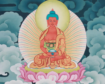 Manjushri's four-armed form is shown in the canvas print, emphasizing the complexity of wisdom and enlightened action. With a lotus blossom displaying the Prajnaparamita Sutra, which represents supreme wisdom, he holds a flaming sword of wisdom that can cut through ignorance. His other hands are holding a bow and arrow, which stands for concentrated wisdom and the ability to overcome through obstacles on the spiritual path. Manjushri is shown in Yab-Yum union with his consort, demonstrating the inseparable unity of wisdom (prajna) and compassionate means (upaya), which is required for enlightenment. Above them stands Amitabha Buddha, representing infinite light and the ultimate goal of Buddhahood. This work emphasizes the interconnectedness of wisdom, compassion, and enlightened beings in Buddhist philosophy.