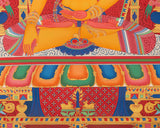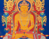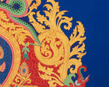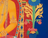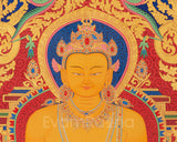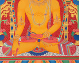 Introducing our stunning digital Newari Paubha print featuring Buddha Ratnasambhava, the Buddha of the South and the embodiment of richness and abundance. Our high-quality print captures the essence of Ratnasambhava's divine presence, making it a meaningful addition to your spiritual practice or home décor collection. Buddha Ratnasambhava is depicted with a golden complexion, seated on a lotus throne with his right hand extended in a gesture of generosity and his left hand holding a bowl of jewels. His serene expression and vibrant colors reflect his peaceful and powerful nature and his ability to grant wealth and prosperity. With this print, you can invite the blessings of Buddha Ratnasambhava into your life and enhance your spiritual journey.