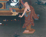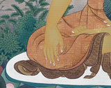 In this Shakyamuni Buddha thangka, Buddha is placed at the center, surrounded by snow mountains, rocks, trees, a river, and a stream. Even though there are many subjects in the background, somehow the whole painting looks soft and calm. Just like the quality of Buddha- Calm and still. We have used soft green and blue to bring harmony with the golden body of Buddha. Hence the whole painting looks balanced and harmonious.