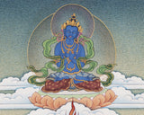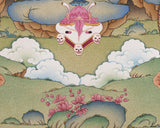 This Chakrasamvara Vajravarahi thangka print is painted in exquisite manner. As the family head, we have Buddha Akshobhya on the top, and the central father's mother is surrounded by the four Dakinis. Painted in natural stone color, this stunning thangka is in Karma Gadri style.