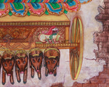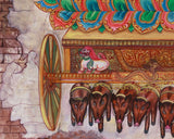 The Marichi is seated on a blooming lotus throne, which is positioned atop a golden chariot drawn by nine boar-headed figures. Her golden face radiates peace, the right red face channels wrathful determination, and the left boar face reflects her dawn-related nature, dispelling ignorance and obscurity. She wears a five-jeweled crown, flowing silk garments, and divine ornaments, holding potent ritual objects in her eight hands. Surrounding her is a radiant aureole styled like the rays of the rising sun, bordered with flames and beaded mandala motifs. A golden halo behind her head emphasizes her divine luminosity, while the temple-inspired background with cracked stone textures, ritual bells, and suspended oil lamps makes this Marichi print a testament to her divine luminosity and role in enlightenment.
