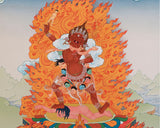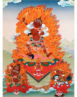 This is an exclusive beautiful thangka print of the revered and mighty deity Ekajati with Rahula and Dorje Legpa for Ekajati mantra practice. Ekajati is a legendary figure in Tibetan Buddhism, revered for her capacity to defend and uplift her followers. With her wild hair, several arms, and ferocious demeanor, Ekajati is depicted artistically. Each feature represents a distinct facet of her enlightened nature. You are drawn into her realm of awe and adoration by her piercing glance and magnetic aura.
