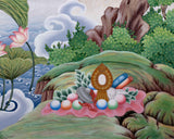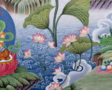 Immerse yourself in the ethereal world of spirituality with this exquisite Guru Rinpoche Thangka print. Revered as the "Precious Master," Guru Rinpoche exudes an aura of divine wisdom and compassion. In this captivating artwork, Guru Rinpoche sits in a lotus position, symbolizing his profound meditative state. His hands are gracefully positioned in the Dhyana Mudra, representing absolute concentration and inner tranquility. Radiating tranquility and serenity, this print serves as a powerful reminder of the path to enlightenment. The print is vividly able to capture intricate details, from vibrant colors to delicate facial expressions, offering a visual feast for the senses. Display this sacred artwork in your sacred space and invite the transformative energy and blessings of Guru Rinpoche into your life. This Thangka print is a cherished symbol of spiritual growth and enlightenment.