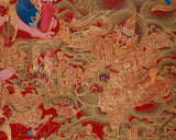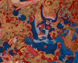 The Six-Armed Mahakala Thangka Print is a high-quality giclée reproduction on cotton canvas, showcasing one of the most formidable guardians in Tibetan Buddhism. It features a deep red background with radiant golden Hues, resembling spiritual ferocity and sacred elegance. The deity, Mahakala, is depicted in a deep blue form, embodying compassion and unwavering resolve. Each of his six arms wields symbolic implements: the trident, sword, noose, skull cup, damaru (ritual drum), and rosary of skulls. These represent his mastery over fear, ignorance, ego, and other forces that hinder spiritual progress.