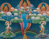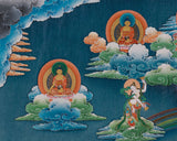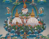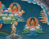 This Thangka print is genuinely one-of-a-kind, exhibiting a very intricate and intricate style of painting that captures the rich creative and spiritual traditions of Tibetan Buddhism. The artist's skill with symbolic representation and visual narrative is demonstrated by the detailed depiction of the Five Dhyani Buddhas and the center Bouddha Stupa. From the colorful Buddhas sitting on clouds to the surrounding landscapes, temples, and spiritual beings, every figure and element in the Thangka is carefully drawn to create a composition that is both harmonious and profoundly meditative.