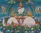 This Thangka's ability to blend exquisite visual detail with spiritual significance is what makes it so unique. The landscape is given vitality and life by the striking use of hues, which range from deep blues and greens to gold, and layers of significance are added by the incorporation of legendary characters and organic components. The exquisite clouds and greenery, as well as the rainbow that surrounds the stupa, all add to the sense of transcendence and spiritual elevation, making this piece of art not only aesthetically pleasing but also profoundly meditative.