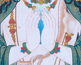 In this four armed avalokiteshvara thangka print, Chenrezig is gracefully seated in meditation posture surrounded by fully bloomed flowers. This high quality bodhisattva art portrays Chenresig folding his two hands in a devotional gesture. The upper right hand holds the never-ending cycle, akashamala, and his upper left hand holds a white lotus.