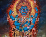 This stunning four-armed Mahakala Thangka print illustrates the mighty and protective essence of Mahakala, a renowned Tibetan deity. His blue skin signifies the infinite aspects of nature and the transformative strength of enlightened insight. Encircled by a halo of flames, his form radiates vibrant energy, representing the triumph over ignorance and ego. Adorned with skulls that symbolize the transitory nature of existence, he wields ritual implements, including a skull cup, associated with tantric traditions. His wild embrace and numerous arms indicate an extraordinary ability to swiftly uphold the Dharma.