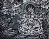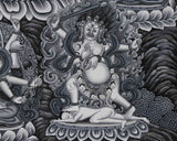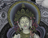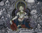 Introducing our Green Tara Digital Print, a high-quality giclée print on cotton canvas, designed to capture the sacred essence of the Goddess of Compassion in a visually striking and spiritually soothing format. The monochromatic edition features Green Tara seated on a lotus throne, adorned with intricate sacred symbols such as the Vajra, Dharma Wheel, and Double Vajra, symbolizing strength, wisdom, and the indestructible nature of the enlightened mind.