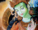 This exquisite newari painting print features the compassionate and protective Mother Green Tara, perfect for Green Tara mantra symbol. The print captures the goddess in her peaceful yet powerful form, with her arms representing her ability to aid all who call upon her. As a beloved figure in Tibetan Buddhism, Green Tara is known for her swift response to those in need and her ability to grant wishes and bring prosperity. The Green Tara mantra symbol, also known as "Om Tare Tuttare Ture Soha," is a powerful invocation of the goddess's energy and can bring peace, protection, and blessings. Display this sacred painting in your home or spiritual practice to connect with the transformative power of Mother Green Tara and the potent symbol of her mantra.