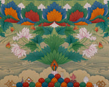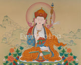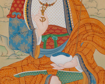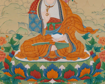 The Guru Rinpoche Thangka Artwork Thangka Print encapsulates the profound spiritual legacy of Padmasambhava, revered as the Lotus-Born Guru Rinpoche in Tibetan Buddhist tradition. This sacred artwork portrays Guru Rinpoche with an aura of transcendent wisdom and boundless compassion. Clad in resplendent robes and adorned with symbolic attributes, he sits upon a lotus throne, radiating divine grace and empowerment. The intricate details of the Thangka print capture Guru Rinpoche's serene countenance and the depth of his spiritual presence, inviting viewers into a realm of inner peace and spiritual realization. As a master of transformation and liberation, Guru Rinpoche's image in this Thangka serves as a potent reminder of the potential for enlightenment inherent within each being. Displaying this sacred artwork in homes and sacred spaces invites the blessings and guidance of Guru Rinpoche, fostering spiritual growth, protection, and the realization of one's highest aspirations.