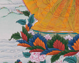 The Buddhist Thangka print of Guru Rinpoche in rainbow body portrays him seated on a lotus of alternating blue with red and green with orange petals. The thangka picturizes his body, radiating rainbow colors looking divine. The Halo and Nimbus behind him also emit different colors looking like a bright sun.