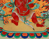 In Buddhist tradition, Hayagriva—a stately horse-headed deity—is honoured as the Divine Guardian. Hayagriva is seen in this finely crafted Thangka standing tall and exuding strength and protection. A renowned figure in Buddhism, Vajrapani is shown at the top middle of the Thangka, signifying strength and the wielding of the thunderbolt of enlightenment. Offering followers a sign of strength and protection on their spiritual path, Hayagriva and Vajrapani together represent strong guardianship and spiritual prowess.