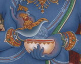 This thangka print is dedicated to the practice of the Mahakala mantra. In the realm of Tibetan Buddhism, Mahakala reigns supreme. His visage is one of fierce determination, armed with a curved knife held by a Vajra handle - an emblem of his invincible might. His countenance, crowned with a five-skulled crown, symbolizes mastery over the five poisons of ignorance, attachment, anger, jealousy, and pride. Upon a Lotus seat, the deity exudes regal splendor, basking in the radiance of a sun disc. This thangka print is an exquisite exemplar of Buddhist artistry, a treasure for any devout practitioner. Thangkas are esteemed in Buddhist ceremonies, and this particular piece is especially suitable for surmounting obstructions and negativity while fostering serenity and harmony.
