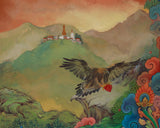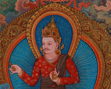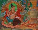 This print features the original Jamana Gubaju thangka, a revered Mahasiddha from the Kathmandu Valley who transcended earthly boundaries to attain profound wisdom and peace. The vibrant print honors his journey, capturing the essence of his spiritual power and connection to tantric Buddhism, showcasing his profound wisdom and peace.