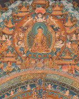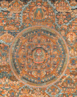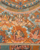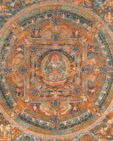 Mandalas come in a variety of shapes and sizes, depending on the nature of the center deity. The Dhyani Buddha Mandala is the most well-known Mandala pattern. The Buddha Mandala is shown in this Thangka. The Mandala signifies a "palace of purity," a magical sphere free of spiritual impurities. The square of the "Sacred palace" proper is utilized in the conclusion in many circles of flame, Vajra, eight centuries (appear only in wrathful deities) lotus, then the inner square to approach the Mandala's deity.