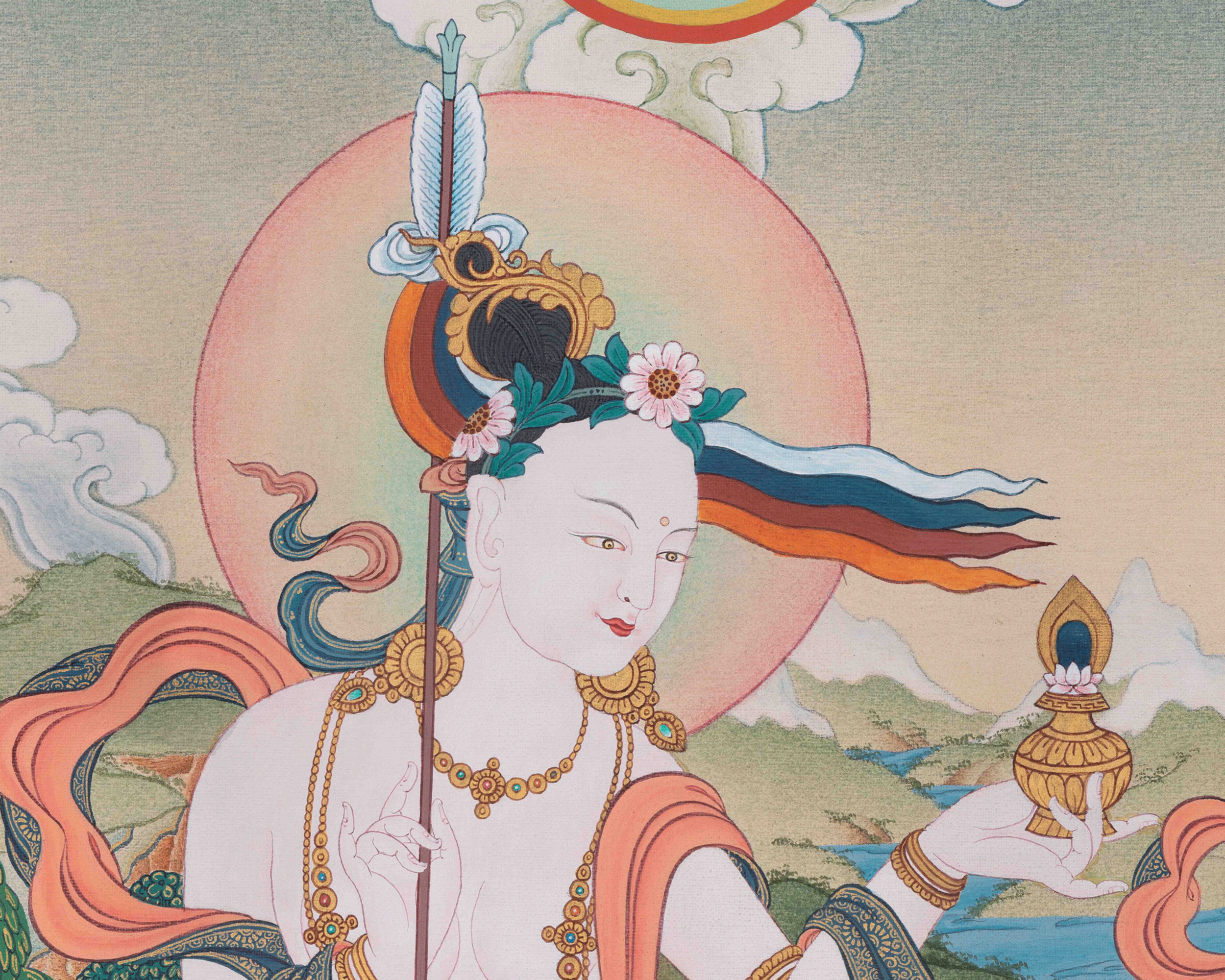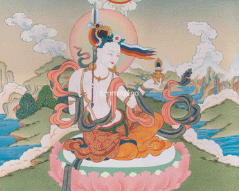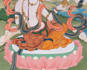 Mandarva, consort of Guru Padmasambhava, is revered as an emanation of wisdom, longevity, and energy. In this thangka, she is uniquely depicted, highlighting her role in tantric practice. Adorned with ornaments and seated gracefully on a lotus, she radiates serenity and spiritual authority. Mantras amplify her blessing energy, making this Mandarva Thangka Print both sacred art and a focal point for meditation or ritual practice.