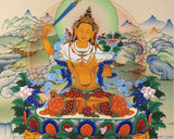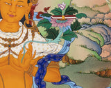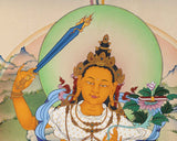 Our Manjushri thangka art print is an exclusive, traditional Karma Gadri style, painted entirely by hand. The mesmerizing cotton canvas is gilded with genuine 24k gold and painted with acrylic colors. This artwork is versatile and suitable for use in Buddhist rituals or regular meditation and yoga practices. The peaceful deity is seated on a moon disc lotus seat, holding a wisdom sword in his right hand and a lotus in his left, with a wisdom book placed above it. Precious gemstones adorn the crown, and valuable pearls embellish the ornaments.