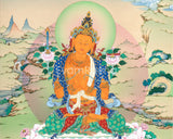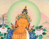 Introducing the Manjushri Canvas Print, an incredibly beautiful depiction of the Wisdom Bodhisattva, radiating wisdom and enlightenment. This exquisite painting, skillfully printed on canvas of the highest standard, beautifully conveys the divine essence of Manjushri. Manjushri is portrayed holding his symbolic blazing sword to wipe out ignorance. The canvas's high quality ensures both longevity and aesthetic sophistication, preserving the vibrant colors and intricate details. Manjushri's profound wisdom serves as a daily wellspring of inspiration, fostering an atmosphere of clarity and spiritual depth when showcased in your home, meditation space, or office. Indulge yourself in the transformative power of this holy thangka print, which is both a timeless addition to your beloved area and an everlasting source of enlightenment.