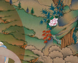 The Life of Milarepa Thangka Print is a masterful hand-painted piece on cotton canvas using all-natural stone colors. In the thangka, Milarepa sits on an animal skin inside a mountain cave, with a peaceful expression on his face. His left-hand clasps a skull cup while his right-hand rests on his right ear in a listening gesture. The verdant green foliage and bright red flowers surrounding the cave provide a serene atmosphere, pleasing to the practitioner. This thangka is perfect for regular meditation, Buddhist rituals, and even home décor. Genuine 24K gold has been incorporated to add to the deity's features and provide a finishing touch.