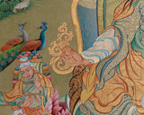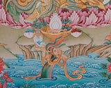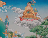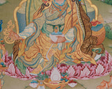 Guru Padmasambhava is depicted seated on a lotus throne, symbolizing purity and transcendence over worldly ties. He holds a vajra in his right hand, representing indestructible wisdom, and a skull cup in his left, symbolizing the transmutation of negative forces into enlightened awareness. Nagarjuna, the eminent Buddhist philosopher who founded the Madhyamaka school and elucidated the notion of śūnyatā (emptiness), is depicted above him on the top right. The inclusion of Nagarjuna emphasizes the continuity of knowledge in the Buddhist tradition. The backdrop features celestial beings and traditional Tibetan symbols, adding to the piece's overall spiritual significance.