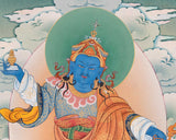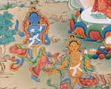 Guru Orgyen Menla, the healing form of Guru Padmasambhava, stands tall in his majestic blue form at the center of this print, symbolizing medicine, healing, and transformation. He holds a healing vase filled with nectar in one hand, offering vitality and long life, while his other hand reaches out in a gesture of protection and empowerment. Richly adorned in golden robes and ornaments, he radiates an enlightened presence.
