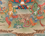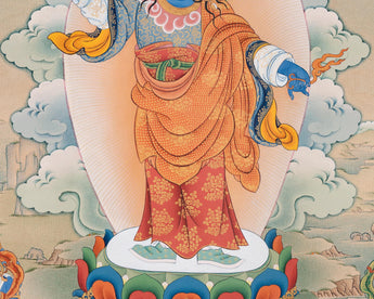Our high-quality Standing Guru Orgyen Menla with Four Elements Thangka Print beautifully captures the original artwork's details, vibrant colors, and spiritual symbolism. Printed on durable canvas in your chosen size, this print is suitable for practitioners, collectors, and admirers seeking to bring Orgyen Menla's healing energy into meditation spaces, altars, or art collections.