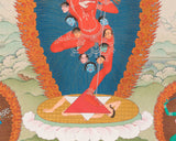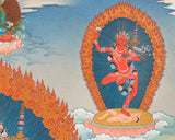 The Thangka Print of Dorje Phagmo embodies the fierce and compassionate energy of the Vajrayogini, a revered deity within Tibetan Buddhism. Known as the "Diamond Sow," Dorje Phagmo represents the embodiment of wisdom, power, and transformation. In this exquisite artwork, she is depicted in her wrathful form, adorned with symbolic ornaments and wielding the vajra and kapala, symbolizing her ability to cut through ignorance and liberate beings from suffering. The vibrant colors and intricate details of the Thangka bring to life the dynamic presence of Dorje Phagmo, inspiring viewers to connect with her fierce compassion and embrace their own inner strength. Displayed in homes, meditation spaces, or temples, this Thangka Print serves as a potent reminder of Dorje Phagmo's protective and transformative qualities, guiding practitioners on the path to enlightenment and spiritual empowerment.