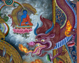 The Vajrapani Thangka depicts the Bodhisattva in a state of fierce allure, caught between glittering gems and ferocious snakes that tested the limits of his compassion. His face was etched with severity, a testament to the effort it took to restrain his emotions. Our artist had captured his wrathful impression, baring four fangs as he strode across a sun disc, surrounded by mountains of captivating colors that only added to his power. The greenery below was but a fleeting detail, insignificant in the face of his dominance. His long hair flowed violently above, while his brows, mustache, and beard were flame-shaped, lending him an almost demonic quality that was both terrifying and beautiful. At the center of his brow, Vajrapani possessed the wisdom third eye, a symbol of his spiritual insight and understanding. Flames of energy erupted from every pore of his strong body, a testament to the raw power and divine presence that he embodied.
