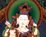 The skilled artisans of Karma Gadri have crafted a stunning Vajrasattva Yab Yum Thangka. The white face of Dorje Sempa and his consort are illuminated by a halo of orange with delicately patterned gold. In his right hand, he holds a Vajra, symbolizing compassion, and in his left hand, a bell, symbolizing wisdom. Serenely, he sits atop a lotus seat on a moon disc, his legs crossed, indicating his detachment from the unclean cycle of samsara for the benefit of sentient beings.