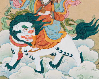 Tsheringma, the goddess of longevity, prosperity, and good fortune, is one of the Five Long-Life Sisters in Tibetan Buddhism. She grants vitality, wealth, and spiritual well-being, protecting practitioners from obstacles that shorten life or hinder prosperity. Depicted riding a snow lion, symbolizing strength, courage, and protection, she holds a vase of immortality nectar in her left hand. Her crown and nine-spoked vajra highlight her divine power to remove obstacles and grant longevity. This Tsheringma Canvas Print elegantly embodies her role as a goddess of long life, rendering it a compelling and inspiring addition to meditation spaces, altars, or sacred art collections.