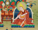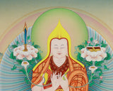 Flanking Tsongkhapa, the two disciples Gyaltsab Je, his principal student, and Khedrub Je, his successor are portrayed with deep respect and devotion. Their presence underscores the importance of the teacher-student relationship in the transmission of the Dharma. The intricate details and vibrant colors of the Thangka are rendered on high-quality cotton canvas, ensuring that every element of the original artwork's symbolism and beauty is preserved. This Thangka not only serves as a spiritual focal point for meditation but also as a testament to the enduring legacy of Tsongkhapa’s teachings and the Gelug tradition. Whether displayed in a meditation space or a place of worship, this Thangka invites a deep connection with the sacred practices of Tibetan Buddhism and the timeless wisdom of its great masters.