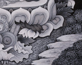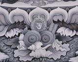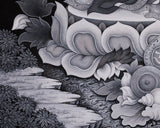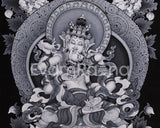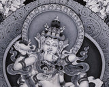 This artwork is not just a visual masterpiece, but a powerful spiritual tool for meditation and purification practices. It features intricate floral and ornamental designs that symbolize the celestial realm and the divine purity of Vajrasattva. The monochrome tones enhance the artwork's depth and clarity. The detailed crown, jewelry, and flowing garments symbolize his enlightened nature and transcendence. Underneath the lotus throne, sacred offerings like conch shells, vajras, and ritual objects represent devotion, purity, and spiritual practice blessings. The high-quality Giclee printing preserves the fine details and sacred energy of the original painting, making it an excellent addition to meditation spaces, shrines, or as a spiritual gift.